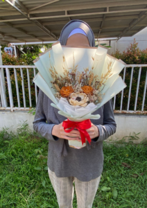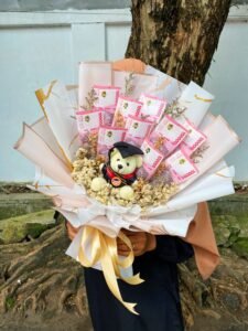 Buket bunga mix juga menjadi rekomendasi buket paling unik diantara ke-empat jenis buket diatas. Terdapat berbagai macam barang yang dirangkai menjadi satu bouquet. Contohnya bunga segar, uang, boneka, atau seperti gambar diatas merupakan bouquet yang berisi boneka, dried flower, dan uang. Unik bukan? Terlihat selaras dan lebih besar. Mix bouquet cocok untuk kado berbagai moment, tinggal sesuaikan saja isinya.